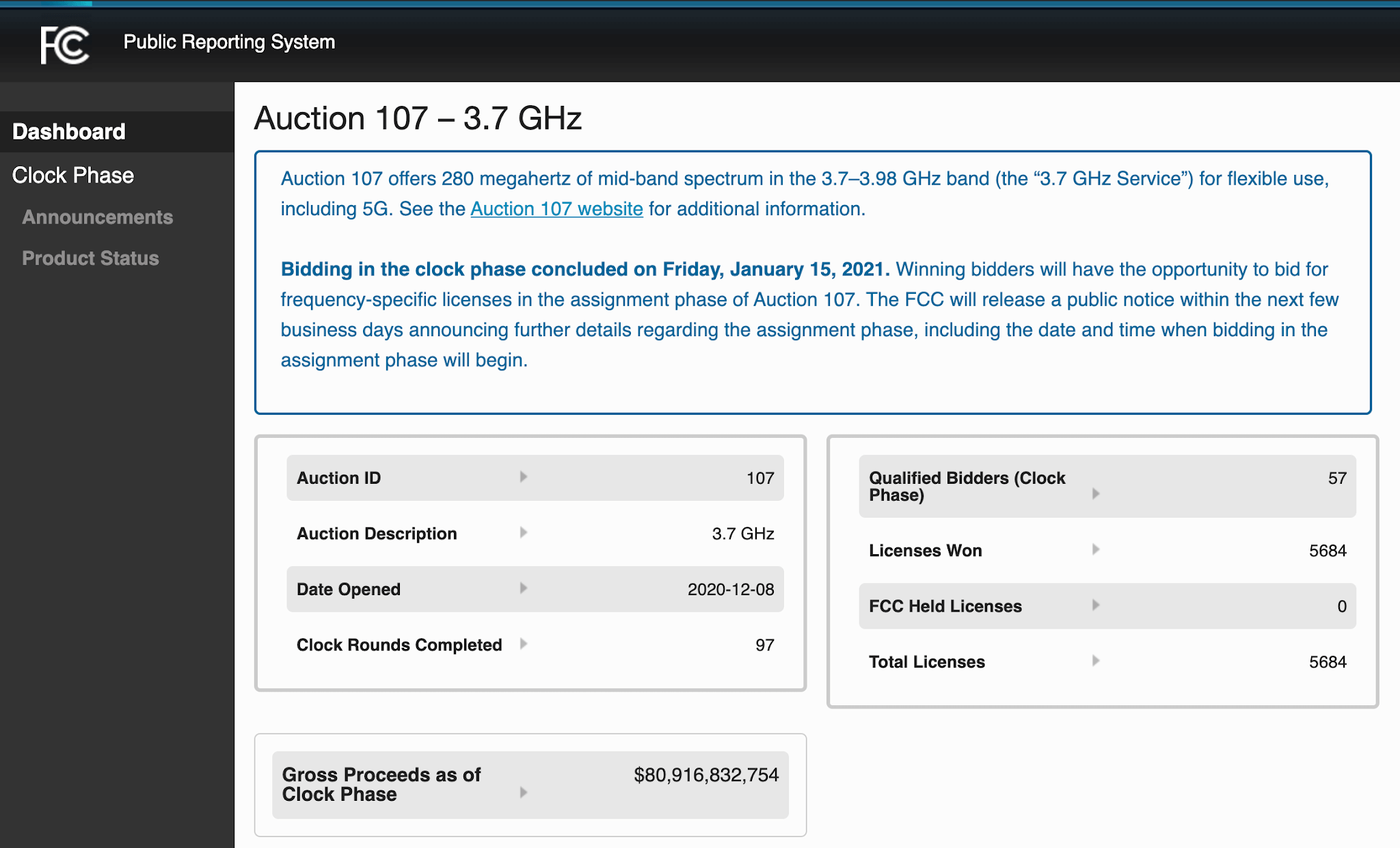 The FCC’s Aution 107 for flexible‐use overlay licenses for spectrum in the 3.7–3.98 GHz band concluded with a record $80.9 billion in bids after 97 rounds.