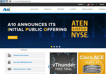 A10’s solutions are built around its Advanced Core Operating System (ACOS), which serves as the high-performance, application-aware networking platform for all of its Application Services Gateway (ASG) products. In 2013, the company launched its A10 Thunder Series product family, which includes an Application Delivery Controller for data centers, a Carrier-Grade NAT for large-scal address and protocol translations in service provider networks, and a Threat Protection System that provides detection and mitigation against DDoS attacks.