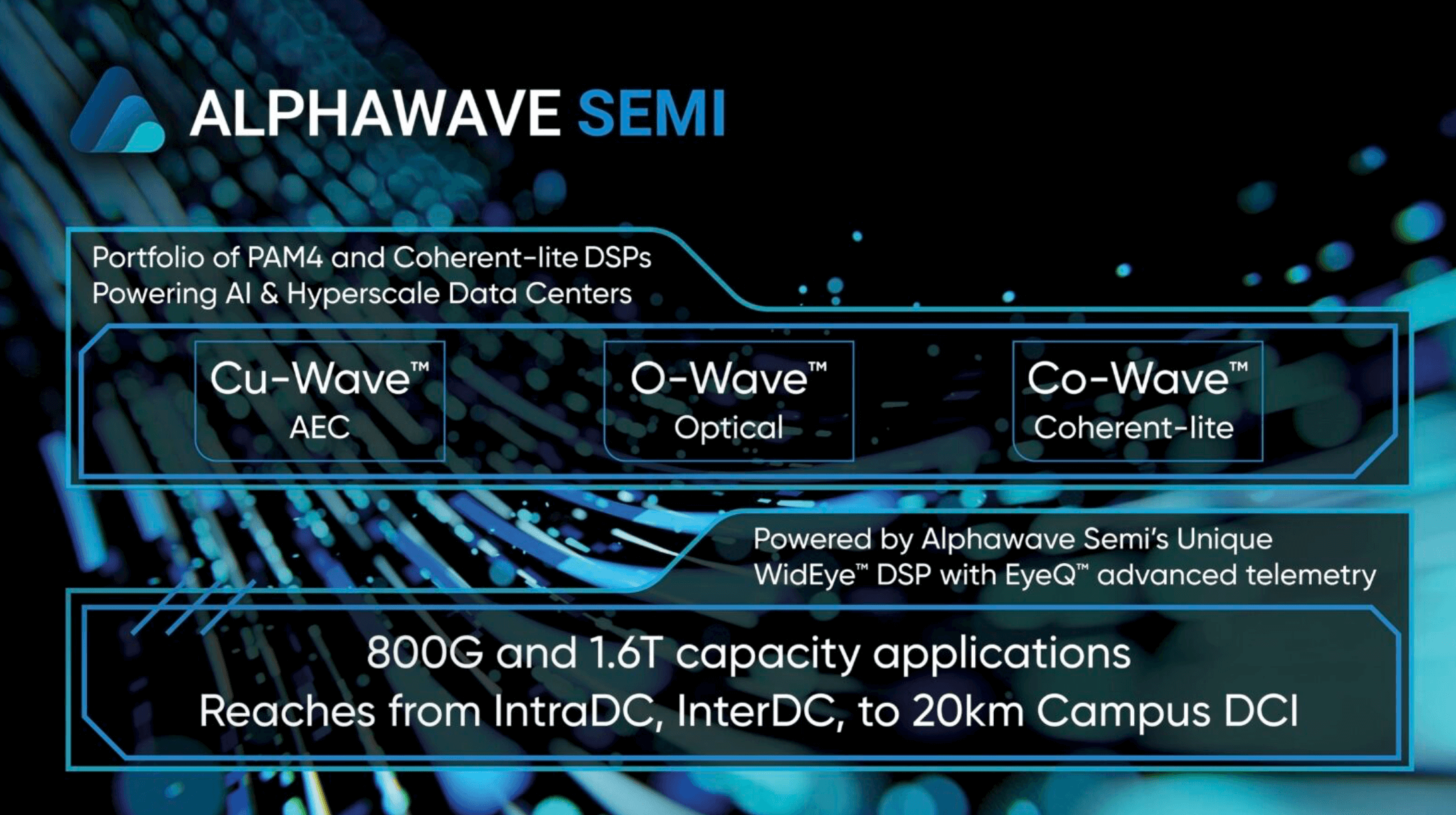 • Cu-Wave™ targets Active Electrical Cables; O-Wave™ addresses optical retimer/gearbox applications; Co-Wave™ enables Coherent-lite optics.