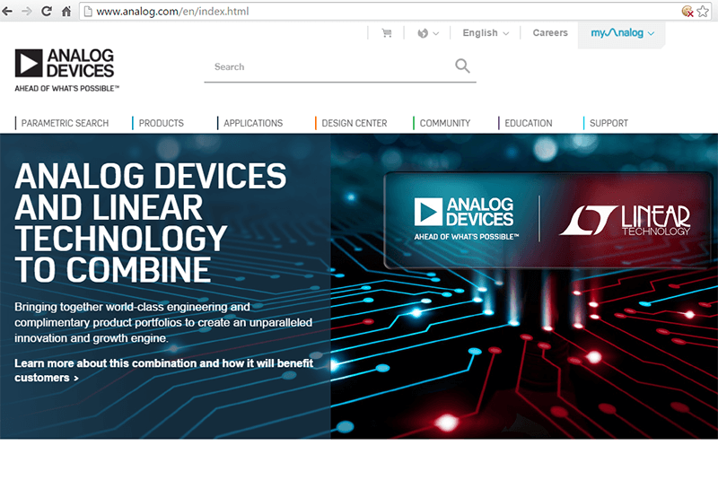 Analog Devices, which is based in Norwood, MA, produces data converters, amplifiers and linear products, radio frequency (RF) ICs, power management products, sensors based on microelectromechanical systems (MEMS) technology and other sensors, and processing products, including DSP and other processors.