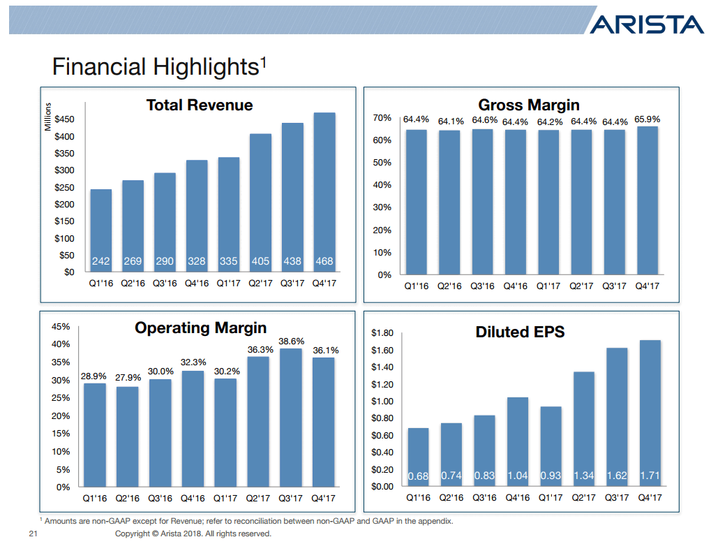 Arista reported Q4 2017 revenue of $467.9 million, an increase of 6.9% compared to the third quarter of 2017, and an increase of 42.7% from the fourth quarter of 2016.