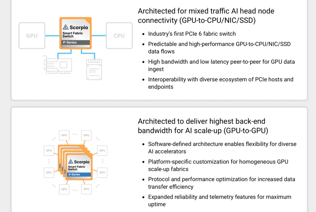 • Scorpio P-Series targets PCIe 6 connectivity for GPUs, CPUs, NICs, and SSDs.