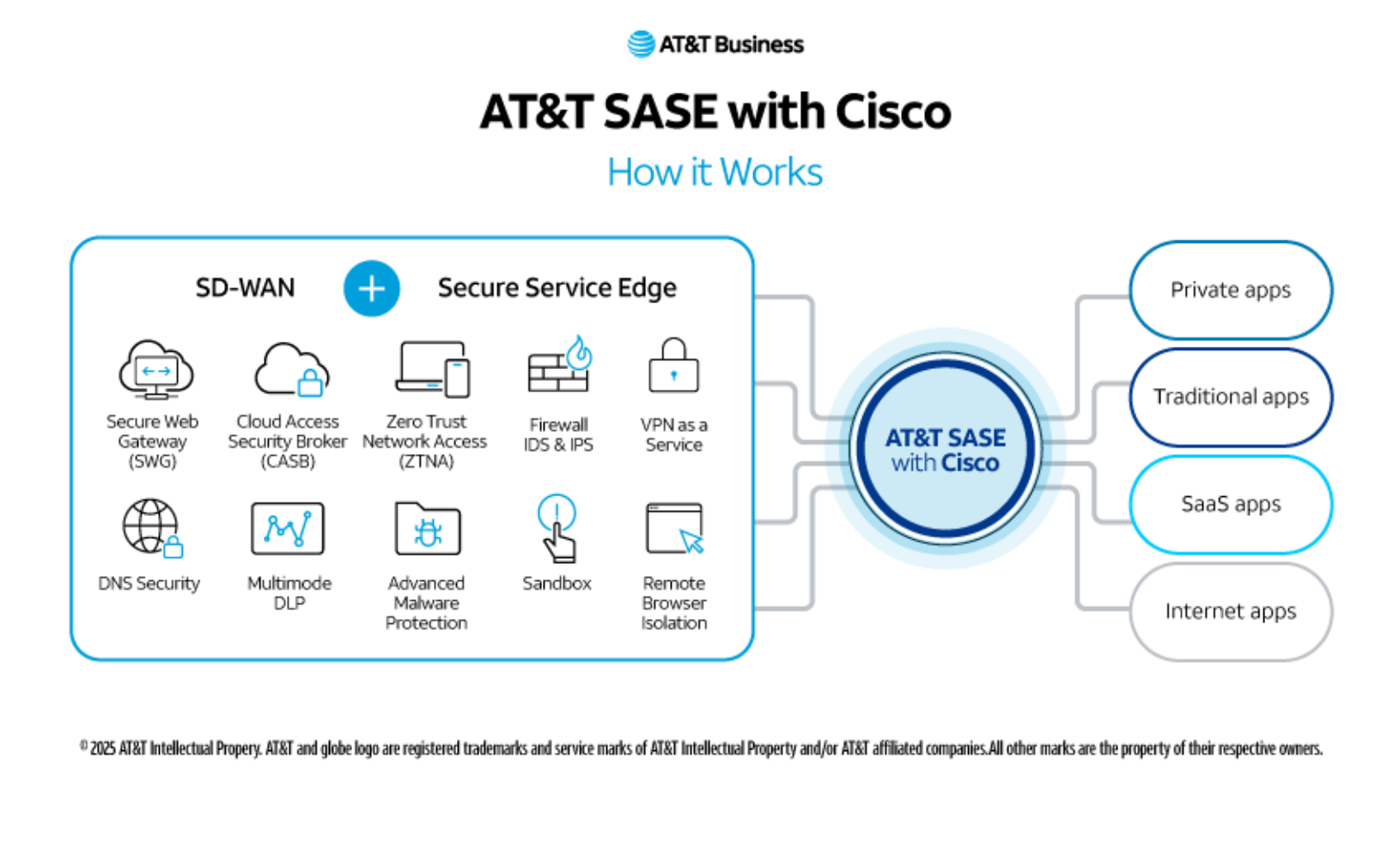 • Combines AT&T’s global network with Cisco’s secure SD-WAN and SSE technologies