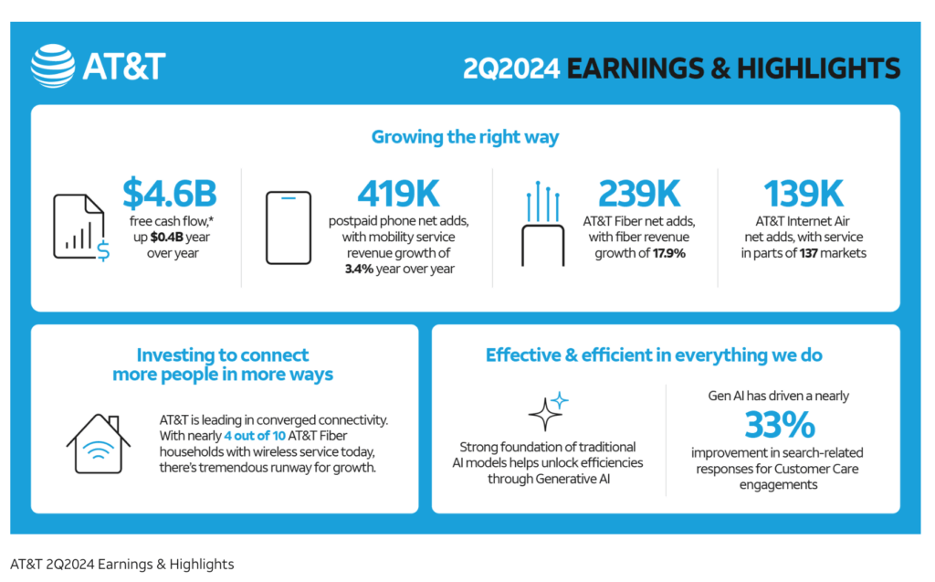 In Q2, AT&T achieved revenues of $29.8 billion, with diluted earnings per share (EPS) of $0.49 and adjusted EPS of $0.57. Operating income was reported at $5.8 billion, with adjusted operating income reaching $6.3 billion. Net income stood at $3.9 billion, while adjusted EBITDA was $11.3 billion. Capital expenditures were $4.4 billion, contributing to a free cash flow of $4.6 billion, which marked an increase from the previous year. These financial outcomes reflect AT&T’s solid performance and strategic investments in 5G and fiber infrastructure.