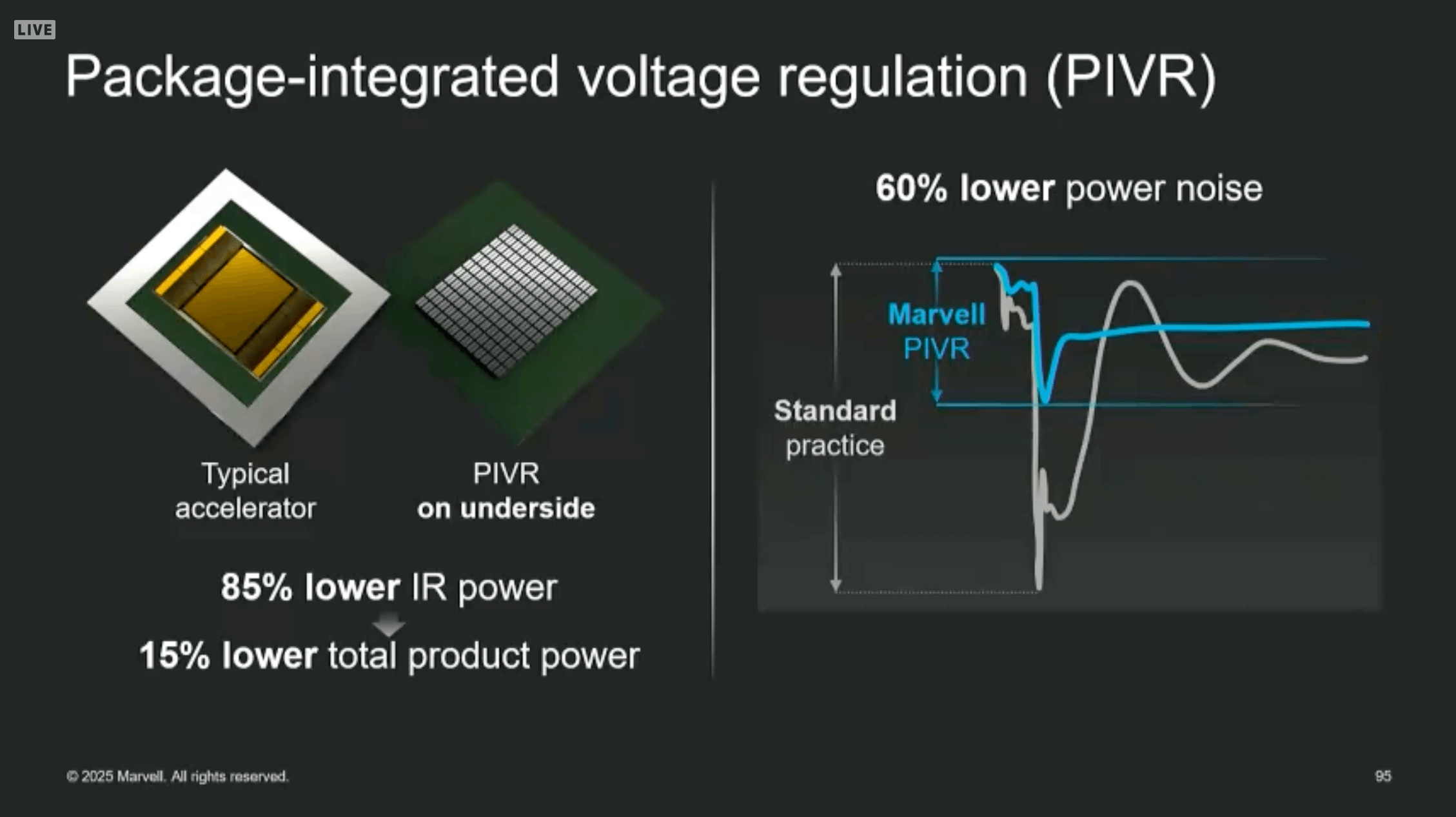 Marvell introduced a new Package Integrated Voltage Regulator (PIVR) solution designed to significantly improve power delivery for high-performance computing platforms in AI and cloud infrastructure. The PIVR technology marks a shift from traditional board-level power architectures toward integrated, chip-level solutions that reduce power loss and increase current density. Targeting custom XPUs and multi-kilowatt compute engines, Marvell’s pre-validated PIVR delivers up to 2x higher current density and up to 85% lower transmission losses in final-stage voltage conversion.