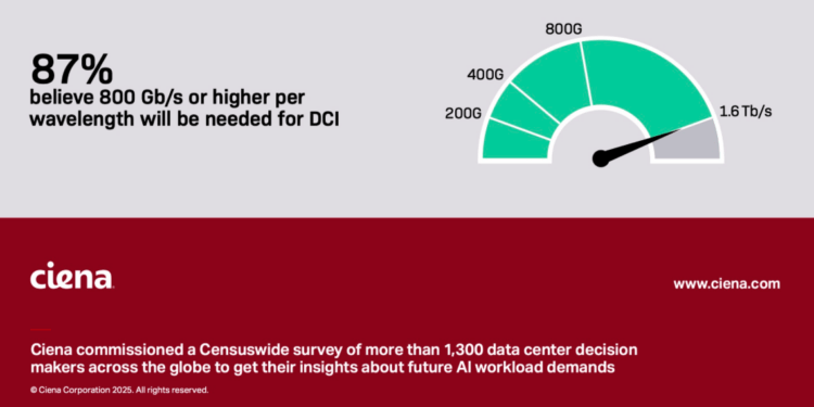 The demand for data center interconnect (DCI) bandwidth is set to surge sixfold over the next five years, as data centers ramp up capacity to support AI-driven workloads, according to a global survey commissioned by Ciena. The study, conducted by Censuswide, surveyed more than 1,300 data center decision makers across 13 countries. It found that 53% of respondents see AI workloads as the top driver of DCI demand over the next two to three years, ahead of cloud computing (51%) and big data analytics (44%).