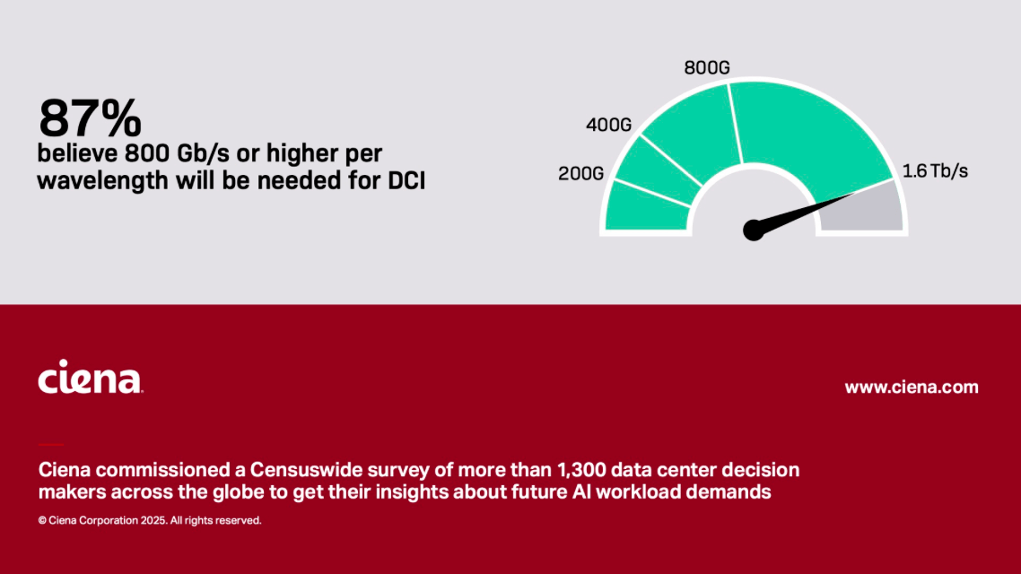 The demand for data center interconnect (DCI) bandwidth is set to surge sixfold over the next five years, as data centers ramp up capacity to support AI-driven workloads, according to a global survey commissioned by Ciena. The study, conducted by Censuswide, surveyed more than 1,300 data center decision makers across 13 countries. It found that 53% of respondents see AI workloads as the top driver of DCI demand over the next two to three years, ahead of cloud computing (51%) and big data analytics (44%).