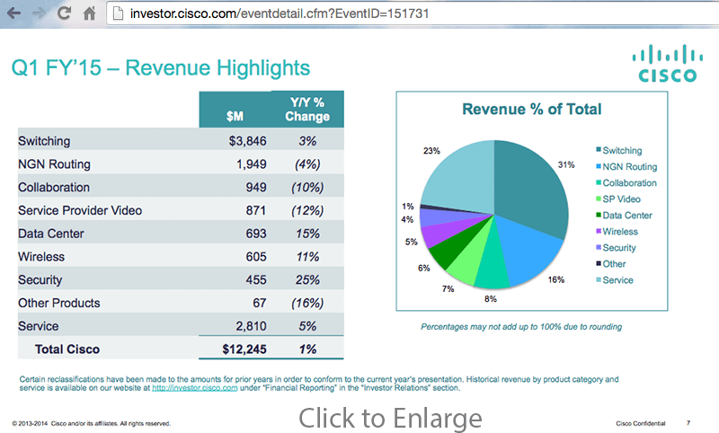 “We are pleased with our results and are very comfortable in our strategy to deliver innovative solutions which enable the next generation of IT and the Internet of Everything. This was our strongest Q1 ever in terms of revenue, non-GAAP operating income, and non-GAAP EPS,” stated Cisco chairman and CEO John Chambers.