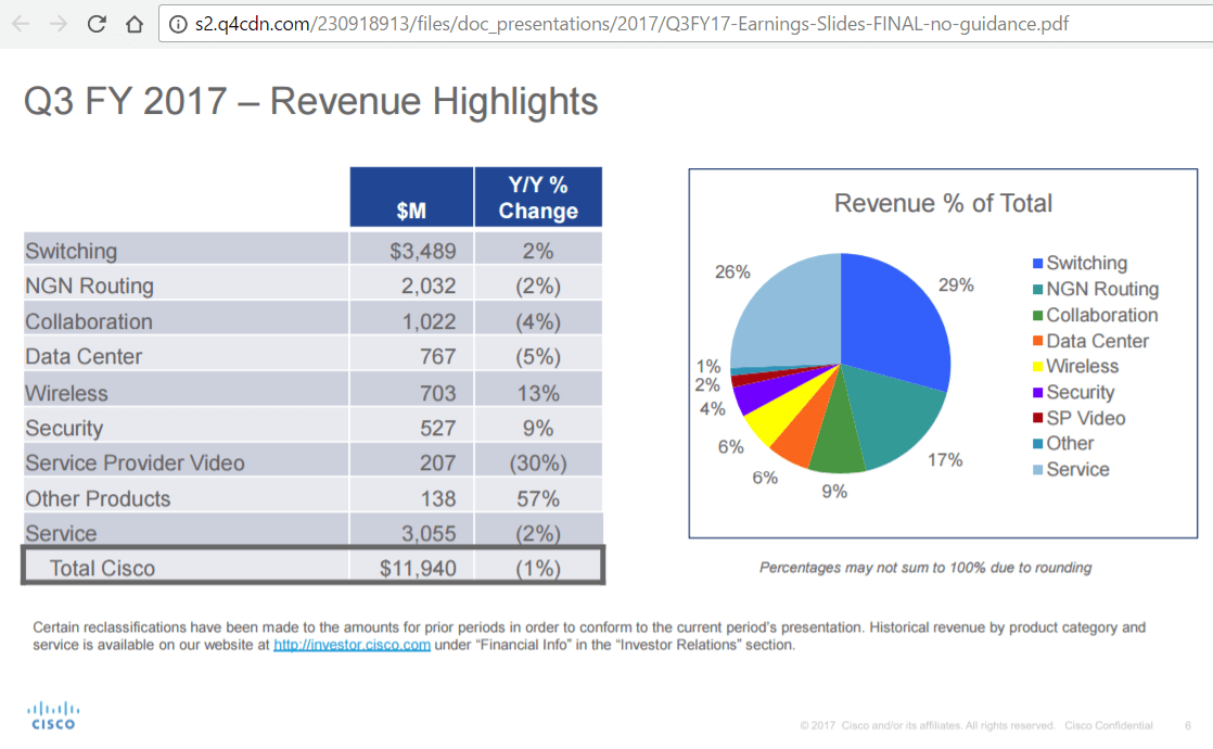 Cisco reported financial results for its third quarter ended April 29, 2017, as follows: