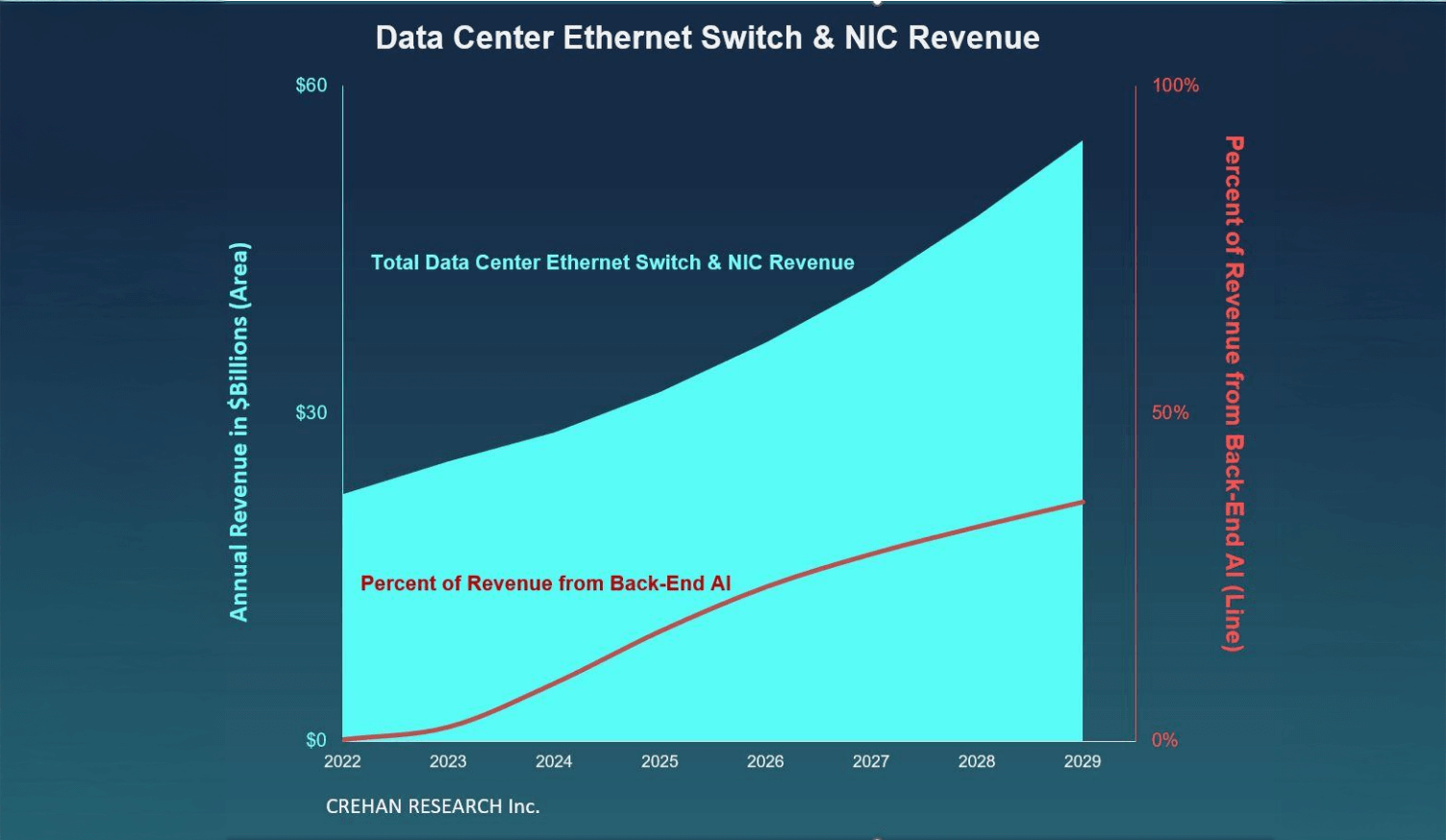 The combined Ethernet switch and NIC market revenue will double within five years to surpass $50 billion, according to the most recent series of Data Center Networking Long-Range Reports from Crehan Research. Generative AI is expected to be a major contributor to the growth, with back-end AI Ethernet networking alone increasing eight-fold to comprise over one-third of the total revenue (see accompanying chart).