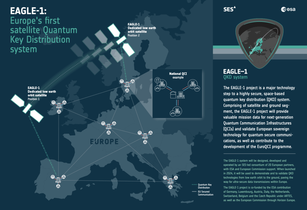 EAGLE-1, which is a consortium led by SES and 20 European partners, is developing a quantum cryptography LEO satellite and ground infrastructure that is expected to launch in 2024. Supported by the European Space Agency (ESA) and the European Commission, EAGLE-1 will deliver secure transmission of encryption keys across geographically dispersed areas and connect EU’s national quantum communications infrastructures for truly sovereign networks.