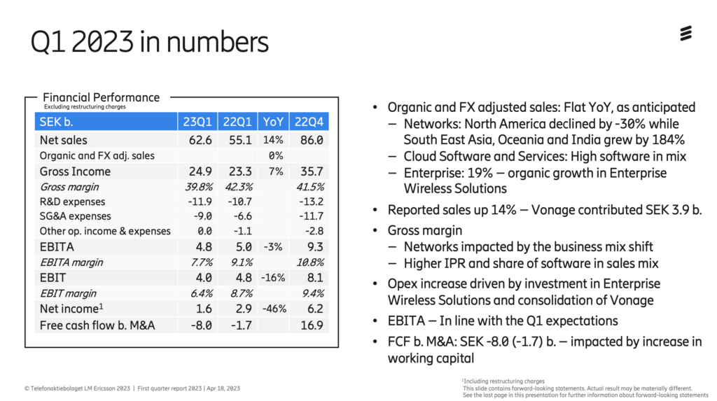 “As expected, customers in early 5G markets have slowed the deployment pace somewhat. Our effect on sales is bigger as some customers have also lowered the elevated inventory levels built up in a tight supply environment. We expect this inventory adjustment to be mostly completed during Q2 but may spill into Q3. Significant growth from large roll-out projects did not fully offset the sales impact from early 5G markets. As expected, the increased share of large roll-out projects pressured the gross margin in Networks, however it positions us well for future growth. In Cloud Software and Services, we continued to execute on our turnaround strategy and reduced our loss slightly more than plan. With this progress, we are on track to reaching the important milestone of break-even in 2023.”