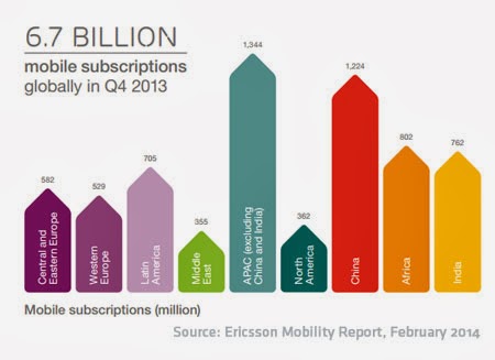 The total number of mobile subscriptions worldwide as of Q4 2013 reached 6.7 billion, of which 109 million