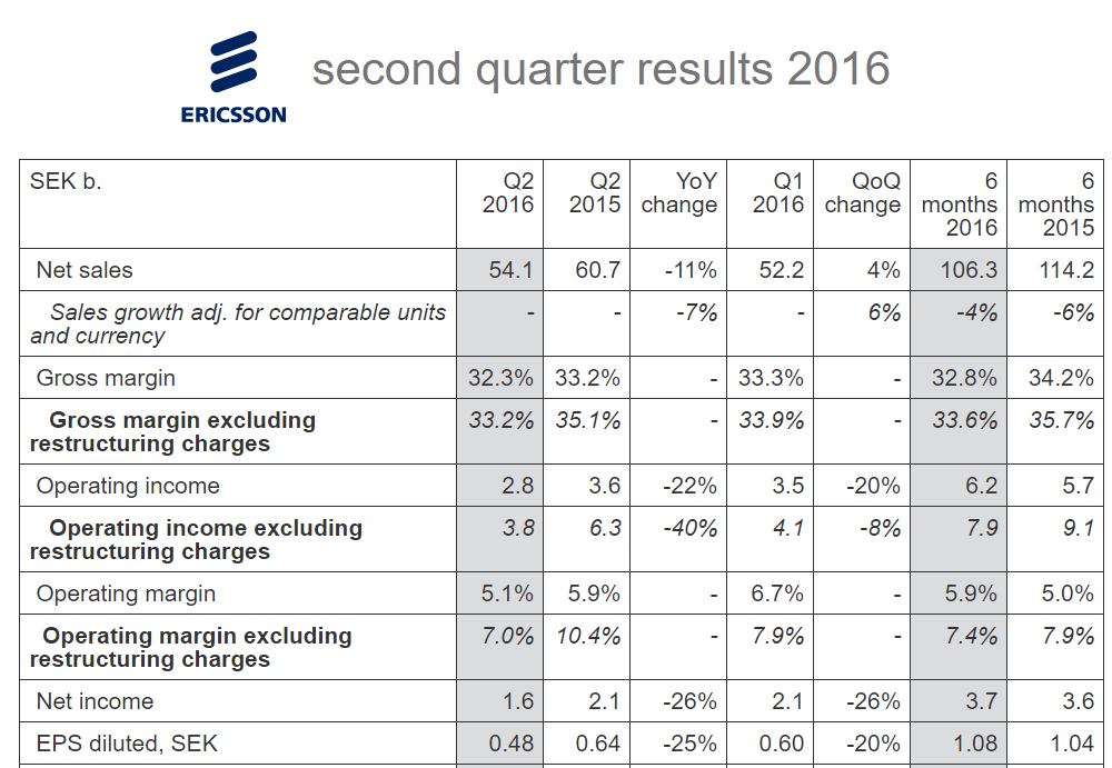 Ericsson’s Q2 sales decreased by 11% YoY, or down 7% YoY when adjusted for comparable units and currency, as mobile broadband sales continued to decline particularly in markets impacted by a weak macro-economic environment, such as Brazil, Russia and the Middle East.
