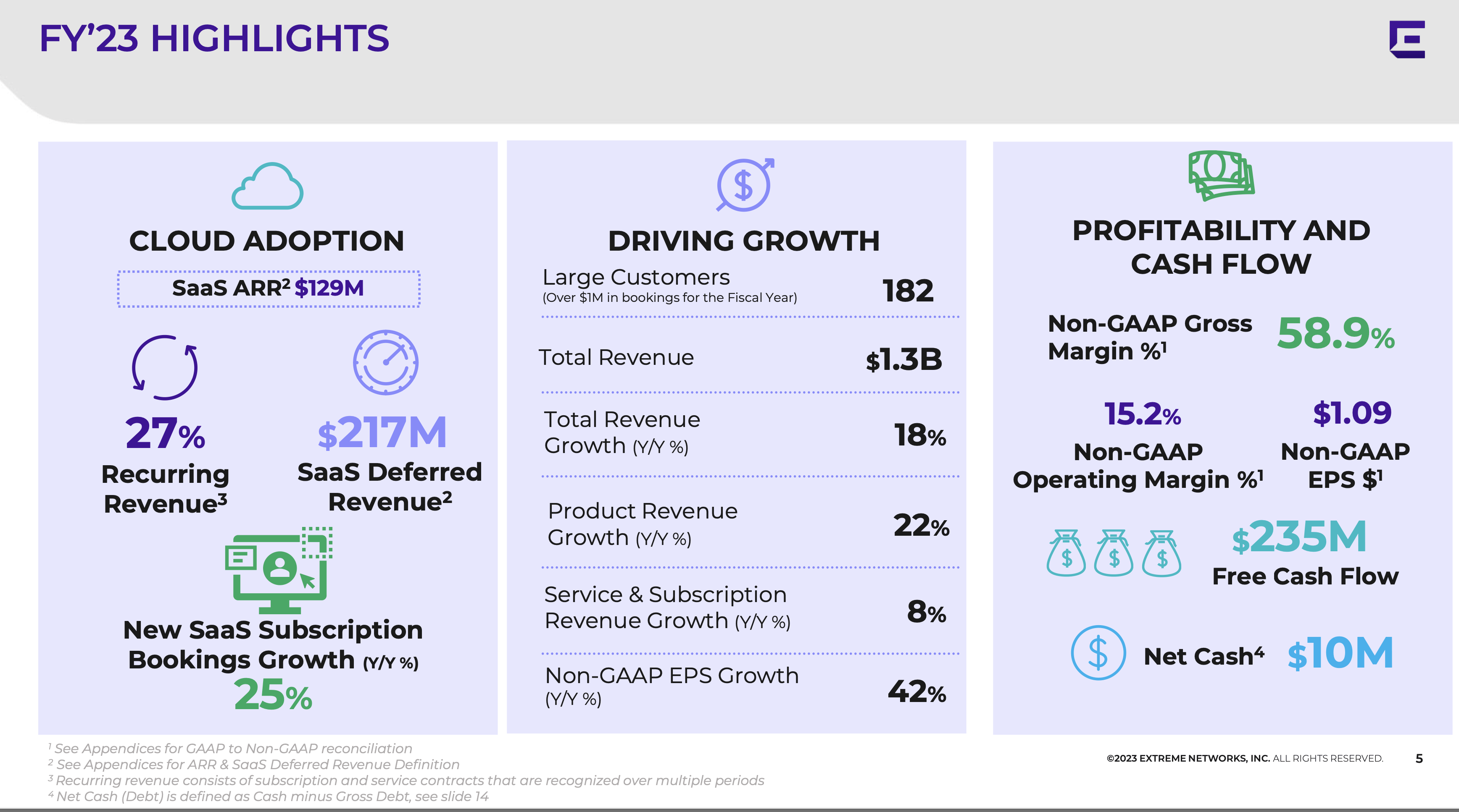 “Extreme delivered a year of exceptional performance, with revenue growth accelerating to 31% in the fourth quarter and 18% overall for the year,” said Ed Meyercord, President and Chief Executive Officer. “This marks our second consecutive year of double-digit growth. We’re outgrowing our competitors, gaining share, and winning new logos, which helped drive more than 30% growth in the value of deals over $1 million. We’re breaking the status quo of networking through product innovation with differentiated solutions like universal hardware, end-to-end cloud management, enhanced AI, and our unique fabric technology, which greatly simplifies network management and bolsters security. Our focus on simplicity, flexibility, and performance continues to fuel our funnel of large opportunities. I remain confident in our growth prospects and am excited about the new innovations and opportunities we have in store for FY24 and beyond,” concluded Meyercord.