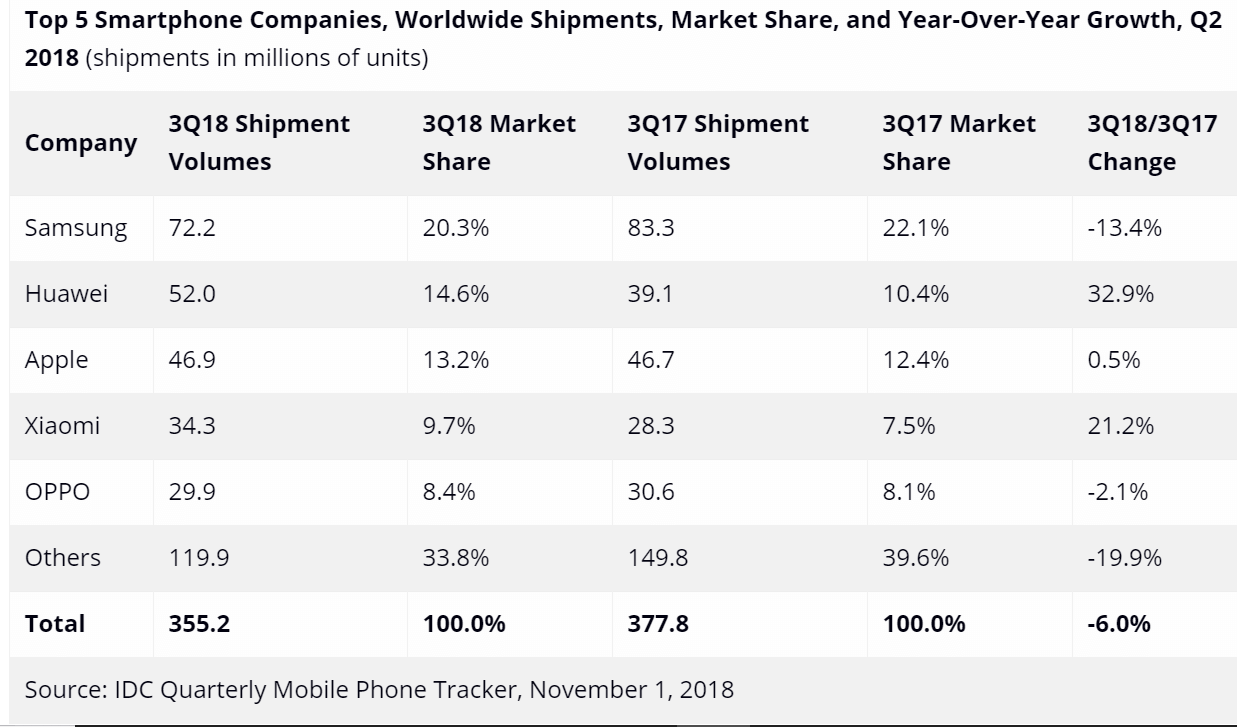 Smartphone vendors shipped a total of 355.2 million units during the third quarter of 2018 (3Q18), resulting in a year-over-year decline of 6.0%, according to preliminary data from IDC’s Worldwide Quarterly Mobile Phone Tracker.