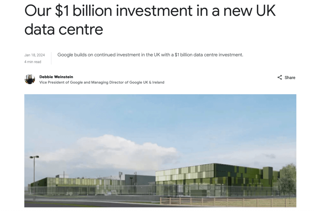 Google announced plans to invest $1 billion in a new UK data centre in Waltham Cross, Hertfordshire.