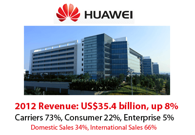 Huawei announced 2012 global sales revenues to reach CNY 220.2 billion (UD$35.40 billion), an 8% year-on-year increase, with a net profit of CNY 15.4 billion (US$2.48 billion), a 33% increase from the previous year. (percentage increase based on CNY)