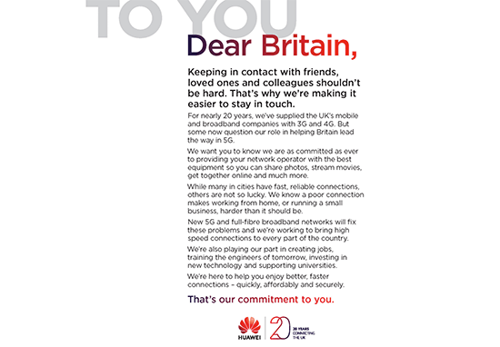 Huawei launched a major advertising campaign in the UK to respond to the rising calls by British politicians to ban it from a meaningful role in the nation’s 5G and gigabit fiber projects.