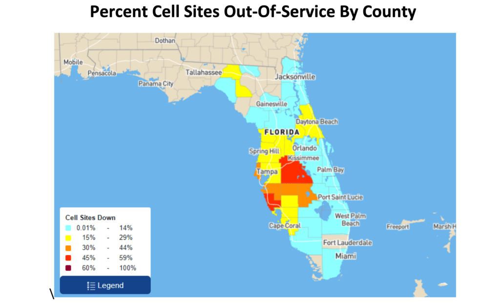As of October 10, 2024, at 9:00 a.m. EDT, a total of 1,953 cell sites in Florida were out of service due to Hurricane Milton, representing 12.3% of the 15,877 cell sites in the state, according to the FCC.