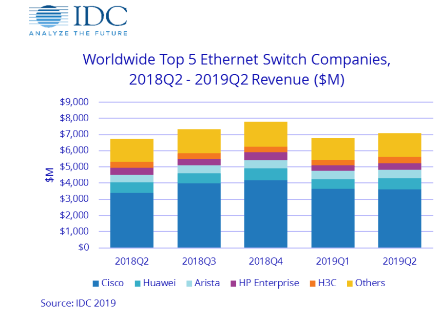 The worldwide Ethernet switch market (Layer 2/3) recorded revenues of $7.07 billion in the second quarter of 2019 (2Q19), an increase of 4.8% year over year, according to IDC’s newly updated Worldwide Quarterly Ethernet Switch Tracker and Worldwide Quarterly Router Tracker. Worldwide total enterprise and service provider (SP) router market revenues grew 3.4% year over year in 2Q19 to $3.96 billion.