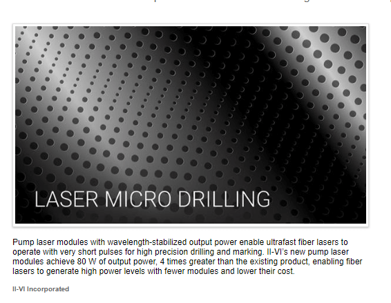 “Our pump laser modules leverage the reliability of our gallium arsenide semiconductor laser platform, proven through broad deployments in industrial laser systems and optical networks, and with decades of field operation,” said Chris Koeppen, Vice President of II-VI Industrial Laser Group. “Beyond ultrafast fiber-lasers for precision micromachining, our product portfolio enables advanced pulsed lasers for other applications including supercontinuum lasers and excitation sources for life sciences.”
