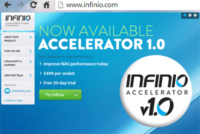 Infinio’s Accelerator is a software-only solution that extends the performance life of an existing NAS. The accelerator is a virtual appliance that uses server-side caching to minimize the I/O traffic load on central storage. It uses 8 GB of idle memory from each ESXi server to create a pooled, deduplicated cache in memory. The product was launched in November.