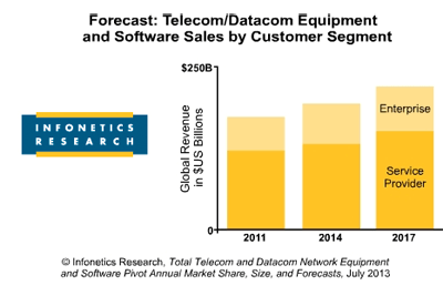 The global telecom/datacom equipment and software market grew 19% in 2010, 7% in 2011, and held steady in 2012 at $172 billion, according to Infonetics.  The market research firm is now projecting the telecom and datacom equipment and software market to grow at a 4.9% CAGR from 2013 to 2017, when it is forecast to hit $218 billion worldwide.