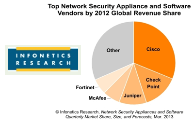 In 2012, Cisco, Check Point, Juniper, McAfee, and Fortinet led the network security market, though Infonetics expects possible share changes in 2013.