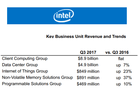 “We executed well in the third quarter with strong results across the business, and we’re on track to a record year,”said Brian Krzanich, Intel CEO. “I’m excited about our progress and our future. Intel’s product line-up is the strongest it has ever been with more innovation on the way for artificial intelligence, autonomous driving and more.”