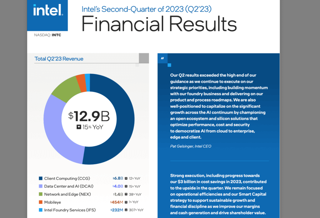 “Our Q2 results exceeded the high end of our guidance as we continue to execute on our strategic priorities, including building momentum with our foundry business and delivering on our product and process roadmaps,” said Pat Gelsinger, Intel CEO. “We are also well-positioned to capitalize on the significant growth across the AI continuum by championing an open ecosystem and silicon solutions that optimize performance, cost and security to democratize AI from cloud to enterprise, edge and client.”