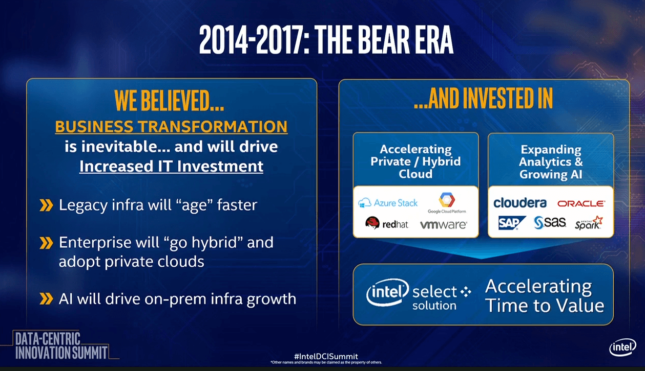 The afternoon talk by Hazra tackled the “Future of the Enterprise” from the Intel perspective. Plenty of Xeon chips have shipped to enterprise customers of the past two decades and the company is determined that this party won’t end for any reason, even to be cannibalized by Xeon sales to the public cloud.