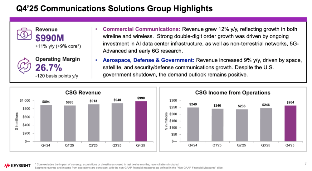 For the full fiscal year, Keysight posted $5.37 billion in revenue (+8% YoY) and generated $1.28 billion in free cash flow. The Communications Solutions Group (CSG) delivered $990 million in Q4 revenue (up 11% YoY), aided by investments in AI data center networking, non-terrestrial networks, and early 6G research. The Electronic Industrial Solutions Group (EISG) grew 9% YoY to $429 million, with strength in semiconductor wafer test, industrial electronics, and digital health systems.