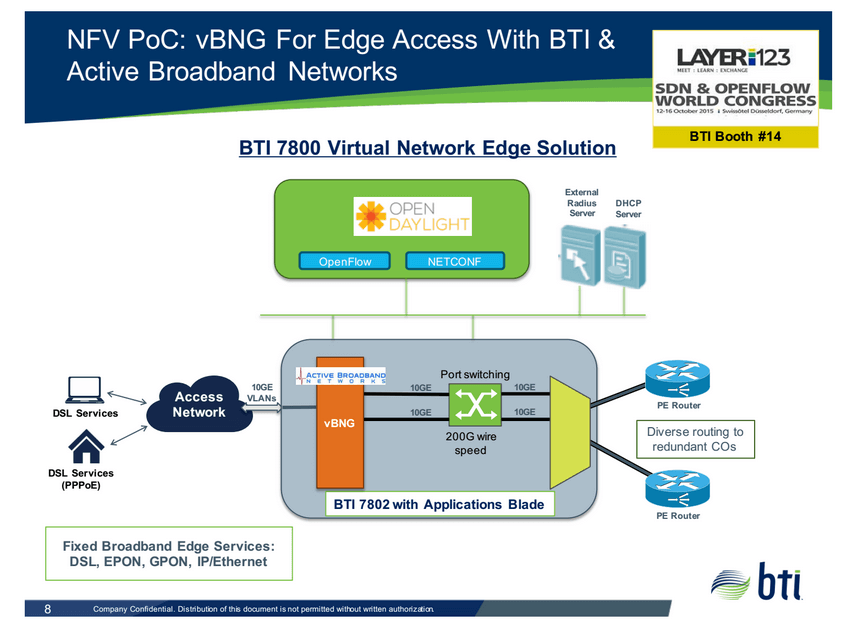 BTI is showcasing the Virtual Network Edge solution at this week’s Layer123 SDN & OpenFlow World Congress in a Proof-of-Concept demo with Active Broadband Network’s Virtual Broadband Network Gateway (vBNG). The companies will feature the hosting of Active Broadband Network’s Software-Defined Virtual Network Gateway (SDN-vNG) software on the BTI 7800 Series. Additionally, the demonstration will show the Network Functions Virtualization (NFV) capabilities integrated in the BTI 7800 Series platform, being controlled and managed from an OpenDaylight SDN controller.
