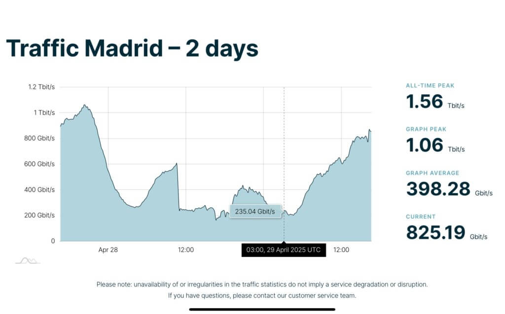 - Internet traffic in Madrid dropped to around 252 Gbps, compared to the normal ~1 Tbps level.