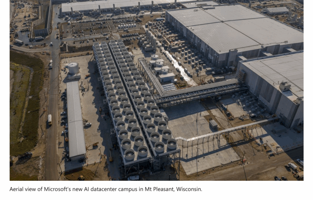 Microsoft unveiled Fairwater, its most advanced AI datacenter to date, located in Mt. Pleasant, Wisconsin. Spanning 315 acres and 1.2 million square feet (111,484 m²), the facility houses three massive buildings and operates as a single AI supercomputer interconnected by a flat networking architecture. The site is powered by hundreds of thousands of NVIDIA GB200 GPUs configured in tightly coupled racks, delivering 10X the performance of the world’s fastest supercomputer. The project required 46.6 miles (75 km) of foundation piles, 26.5 million pounds (12 million kg) of structural steel, 120 miles (193 km) of underground cable, and 72.6 miles (117 km) of mechanical piping.