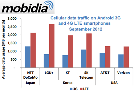 LTE subscribers are consuming significantly more data than their 3G counterparts, according to a new study from Mobidia and Informa that analyzes the usage patterns of 100,000 Android LTE users in Korea, Japan, and the U.S.  Data for the study was captured in September 2012 from the major operators in each country.