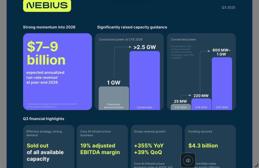 Founder and CEO Arkady Volozh said Nebius has “sold out all available capacity,” driven by AI demand from enterprise and cloud customers. Nebius expects to reach 2.5 GW of contracted power by end-2026 — up from 1 GW previously — with 800 MW to 1 GW of connected power coming online next year. Q3 capital expenditures reached $955 million, largely for GPU purchases and data center build-outs. The company ended the quarter with $4.9 billion in cash and $4.1 billion in long-term debt after raising $4.3 billion in convertible notes and equity offerings in September. Nebius also plans an at-the-market equity program of up to 25 million Class A shares to fund future growth .