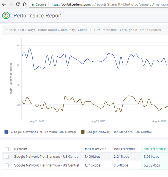 Google has already conducted performance tests of how its Premier Tier measures up to Standard tier. The tests, which were conducted by Cedexis, found that Google’s own network delivers higher throughput and lower latency than a Standard tier with more routing hops and operating over third party network(s). Test data from the US Central region from mid-August indicate that the Standard Tier was delivering around 3,051kbps throughput while Premier Tier was delivering around 5,303kbps – or roughly a 73% performance boost in throughput. For latency in the US Central region, the Standard Tier was measured at 90ms for the 50th percentile, while the Premium Tier was measured at 77ms, roughly a 17% performance advantage.