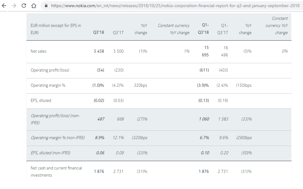 Regarding its Networks business, Nokia said its order backlog was strong at the end of Q3 2018, and that it continues to expect commercial 5G network deployments to begin near the end of 2018.