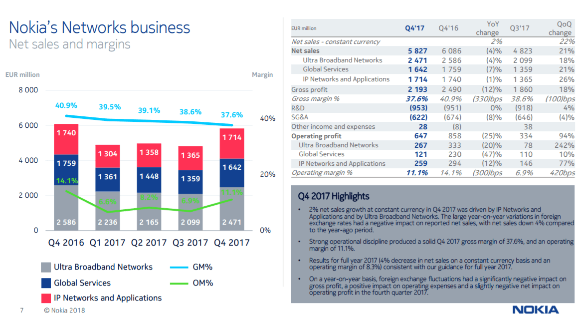 The improved performance of Nokia’s Networks business was driven by IP Networks and Applications and by Ultra Broadband Networks. The large year-on-year variations in foreign exchange rates had a negative impact on reported net sales, with net sales down 4% compared to the year-ago period. Strong operational discipline produced a solid Q4 2017 gross margin of 37.6%, and an operating margin of 11.1%.