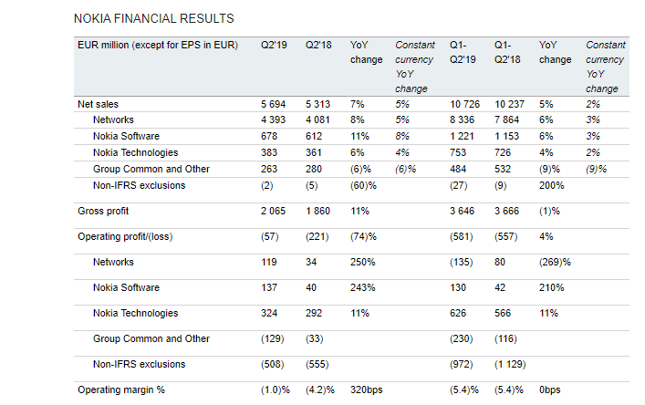 Citing growing 5G demand and growth in four of its six global regions, Nokia reported net sales in Q2 2019 were EUR 5.7bn compared to EUR 5.3bn in Q2 2018. On a constant currency basis, net sales increased 5%. Reported diluted EPS in Q2 2019 was negative EUR 0.03, compared to negative EUR 0.05 in Q2 2018.