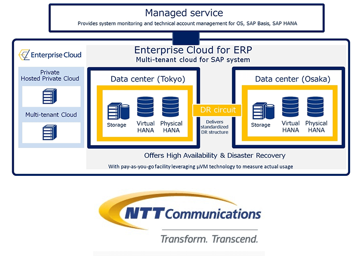 NTT Com’s Enterprise Cloud for ERP service has an option for virtual HANA (offering up to 2.9TB of memory) and physical HANA (up to 8.0TB of memory), which will be available as a multi-tenant cloud platform supporting SAP HANA’s in-memory database architecture. NTT Com plans to offer a “high availability” option that ensures enhanced resilience and disaster recovery via the use of diverse routing and duplicate datacenters in Tokyo and Osaka. The service will also include pay-as-you-go options that leverage μVM resource-management technology to regulate CPU & memory usage, enabling customers to enjoy the flexibility and reliability of a cloud environment combining virtual and physical HANA environments. The service aims to reduce total cost of ownership by up to 65% compared to on-premise systems.