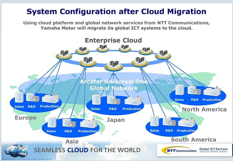 NTT Com will deploy its Enterprise Cloud global cloud service and Arcstar Universal One global network service to create a highly robust and scalable cloud platform. Yamaha Motor will use the platform to strengthen business continuity and slash ICT costs by consolidating currently dispersed servers, networks and other ICT systems on to NTT Com cloud services.