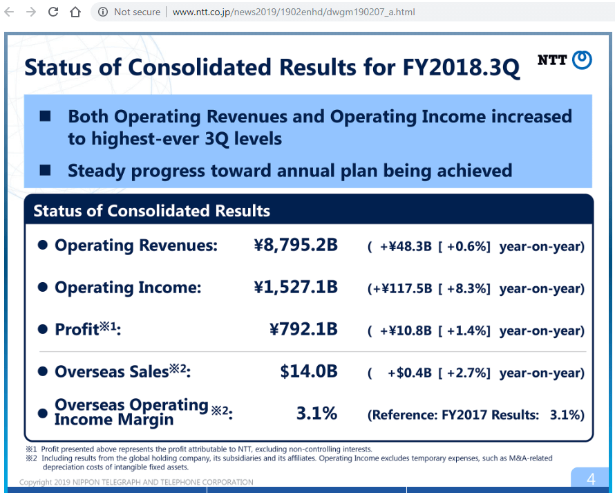 The Nippon Telegraph and Telephone Corp. (NTT) reported that operating revenues for the nine months ending 31-December-2018 grew 0.6 percent to 8.80 trillion yen (approximately U$80 billion) from 8.75 trillion yen last year. Net income attributable to the company for the period increased 1.4 percent to 792.13 billion Japanese yen, while operating income amounted to 1.53 trillion yen, up 8.3 percent from 1.41 trillion yen last year.