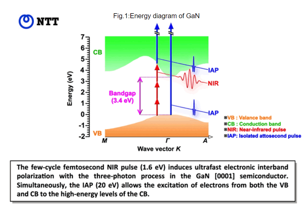 Researchers at NTT and Tokyo University of Science observed electronic oscillation (dipole oscillation) with attosecond (as: 10-18 of a second) periodicity using gallium nitride (GaN) wide-bandgap semiconductor. The experiment marks the first time the petahertz frequency barrier has been exceeded with a semiconductor. NTT said this shows the potential of future petahertz signal processing technology based on ordinary wide-bandgap semiconductor devices.