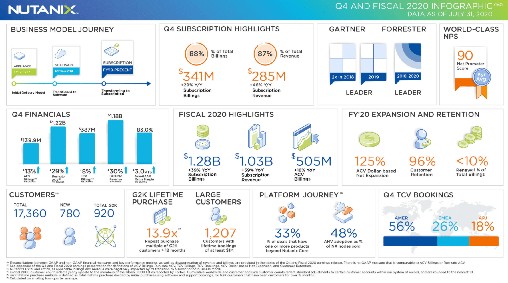 Nutanix reported revenue of $327.9 million for its fourth quarter of fiscal 2020, up 9% year-over-year from $299.9 million in the fourth quarter of fiscal 2019. GAAP gross margin was 79.6%, up from 77.0% in the fourth quarter of fiscal 2019. There was a GAAP net loss of $185.3 million, compared to a GAAP net loss of $194.3 million in the fourth quarter of fiscal 2019; Non-GAAP net loss was $79.0 million, compared to a non-GAAP net loss of $105.8 million in the fourth quarter of fiscal 2019.