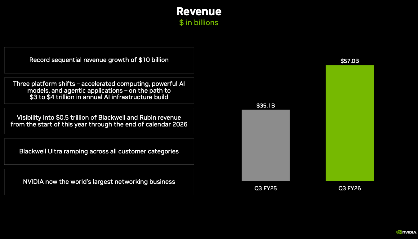 The company cited “off-the-charts” Blackwell demand and said cloud GPUs remain sold out across training and inference markets. NVIDIA highlighted the rapid shift toward massive-context foundation model training, agentic AI applications, and sovereign AI infrastructure. According to the Q3 investor presentation, NVIDIA now has visibility into $0.5 trillion of cumulative Blackwell and Rubin revenue through the end of 2026, underscoring unprecedented infrastructure investment across hyperscalers, nations, and industrial verticals.