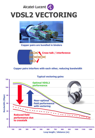 Alcatel-Lucent introduced the first commercial VDSL2 Vectoring solution in September 2011, delivering 100 Mbps over existing copper loop lengths of 400 meters. VDSL2 vectoring uses digital signal processing to remove crosstalk between copper pairs in a bundle, similar to noise cancellation in headphones. From line cards at the central office or DSLAM, the system measures the crosstalk from all the lines in the bundle and then generates an anti-phase signal to cancel out the noise. Alcatel-Lucent developed its own chipset and software. The VDSL2 vectoring is delivered via a 48-port Board Level Vectoring card, a 48-port System Level Vectoring card, and a Vector Processing card supporting up to 384 ports.