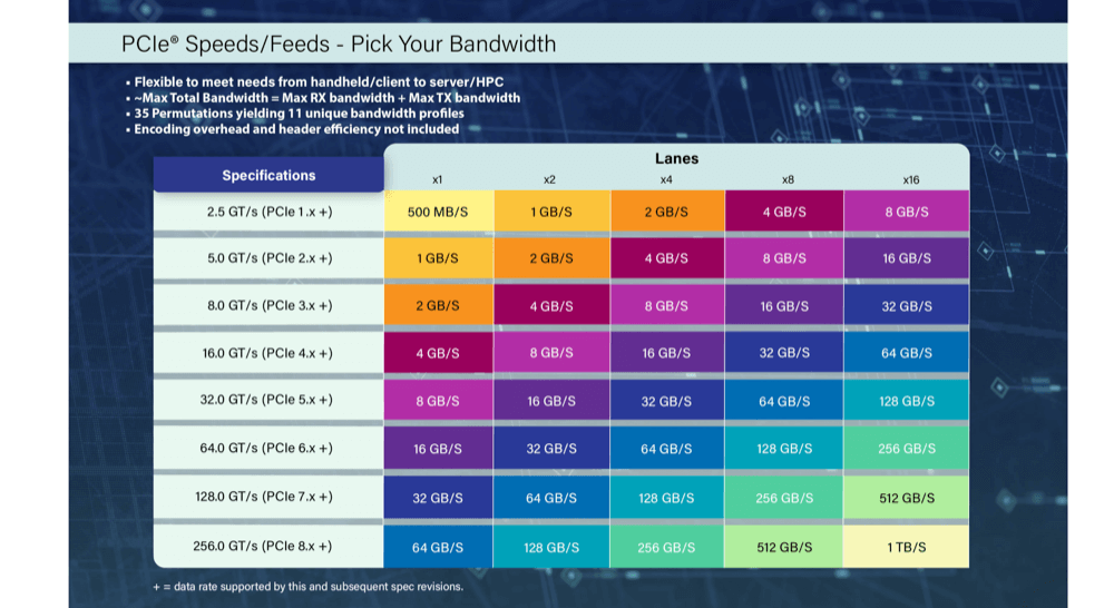PCIe 8.02028 (planned)256 GT/s (~32 GB/s per lane)Up to 1 TB/s on x16, aimed at AI & quantum